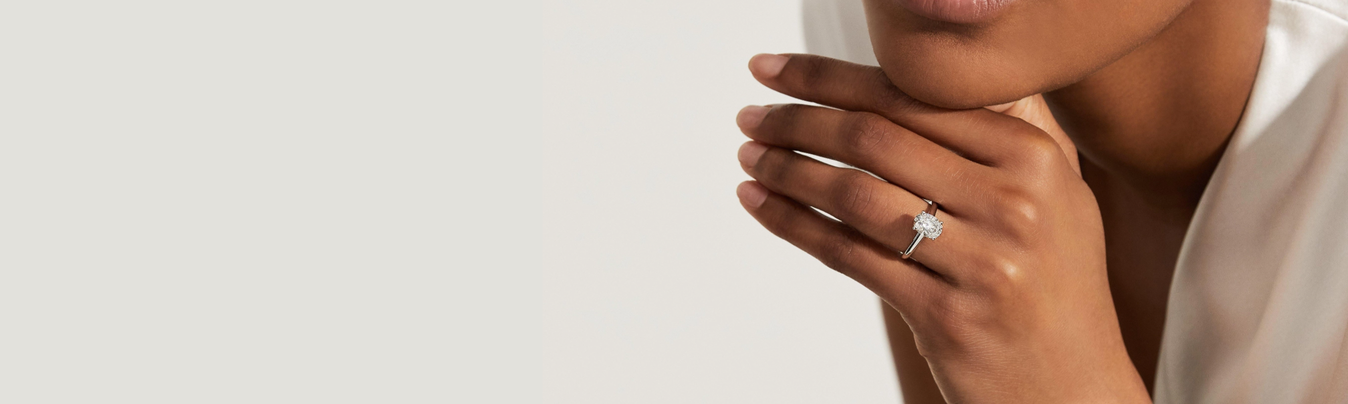 This refined Montaigne Oval Double Hidden Halo Engagement Ring features a contemporary take on the traditional style. Delicately crafted with two hidden halos of round brilliant cut diamonds and a centre stone held in a sturdy four-tiger-claw setting with diamond set shoulders.